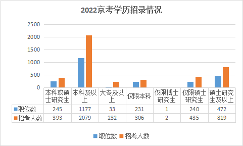 2022北京公務(wù)員考試提供的職位中,學(xué)歷要求劃分明細(xì),大??蓤?bào)職位共有33個(gè),占總職位數(shù)的1.38%,招錄232人,占總招錄人數(shù)的5.44%;本科可報(bào)職位共有1686個(gè),占總職位數(shù)的70.28%;碩士研究生可報(bào)職位共有2167個(gè),占總職位數(shù)的90.33%;博士研究生可報(bào)職位共有1683個(gè),占總職位數(shù)的70.15%;