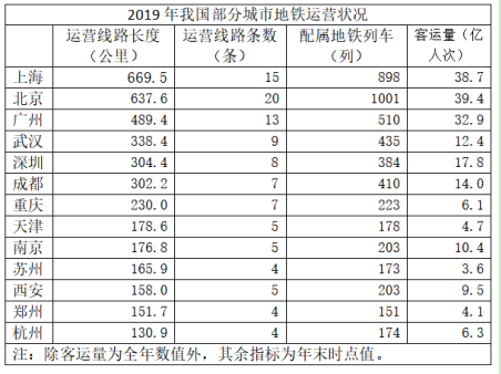 C.表中2019年末地鐵運(yùn)營(yíng)線路長(zhǎng)度排名前3的城市地鐵運(yùn)營(yíng)線路長(zhǎng)度之和占全國(guó)總量的50%以上