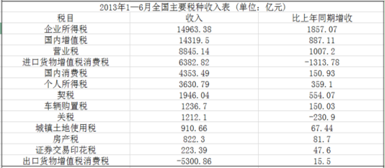 ④2013年我國上半年企業(yè)所得稅、國內(nèi)增值稅兩項之和超過同期稅收總收入的50%