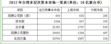 經(jīng)過50多年的發(fā)展,我國臺灣地區(qū)資本市場建立起由“證券交易所集中市場—上柜市場—興柜市場”構(gòu)成的完善成熟的多層級資本市場體系。今年由于金融海嘯、歐債危機(jī)等因素影響,臺灣多層次資本市場總體成交值從2010至2012年連續(xù)3年下降,2012年較2011年衰退23.38%。周轉(zhuǎn)率也呈現(xiàn)逐年下降趨勢,2012年證券交易所幾種市場周轉(zhuǎn)率為97%,上柜市場周轉(zhuǎn)率為175%,興柜市場周轉(zhuǎn)率為27%。