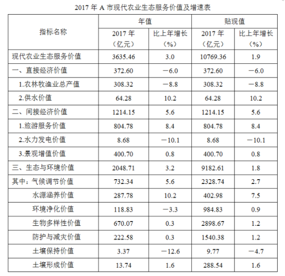 B、2017年A市現(xiàn)代農(nóng)業(yè)生態(tài)服務(wù)價值年值增長率、貼現(xiàn)值增長率最低的是同一個指標(biāo)