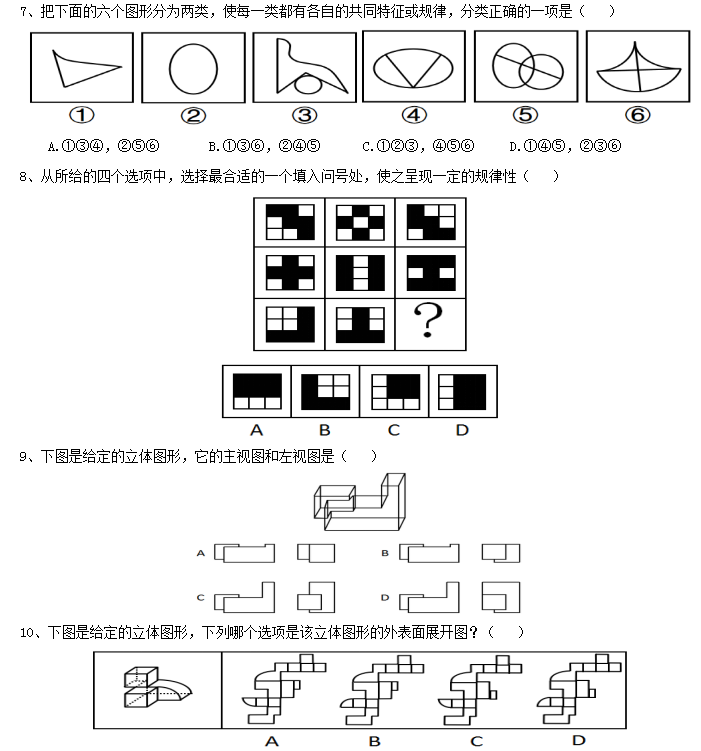 本部分包括圖形推理、定義判斷、類比推理與邏輯判斷四種類型的試題,在四個(gè)選項(xiàng)中選出一個(gè)最恰當(dāng)?shù)拇鸢?/span>