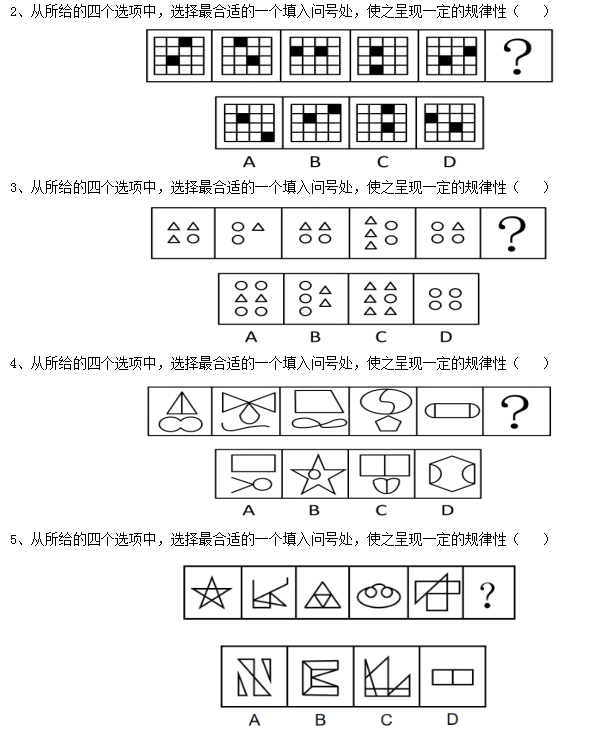 1、從所給的四個(gè)選項(xiàng)中,選擇最合適的一個(gè)填入問(wèn)號(hào)處,使之呈現(xiàn)一定的規(guī)律性( )