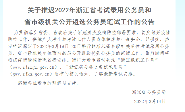 官方通知來(lái)啦?。?!因疫情影響,原定3月19-20日舉行的2022年浙江公務(wù)員筆試再次延期,具體考試日期另行公布!↓↓↓