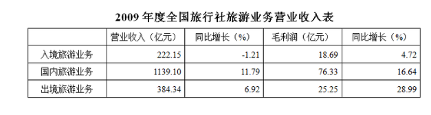 2009年度全國旅行社營業(yè)收入為1806.53億元,同比增長8.64%;毛利潤總額為134.36億元,毛利率為7.44%;凈利潤總額為11.48億元,凈利潤為0.64%。