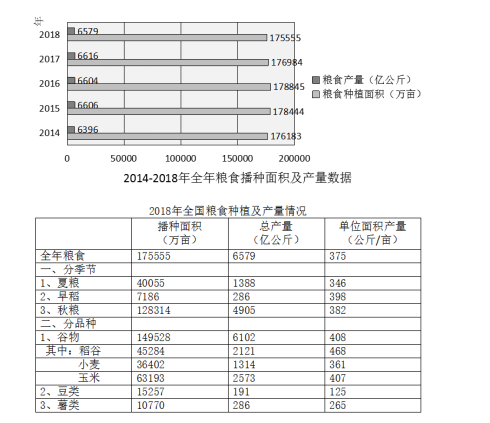 國家統(tǒng)計(jì)局公布的全國糧食生產(chǎn)數(shù)據(jù)顯示,2018年全國糧食播種面積175555萬畝,比2017年下降0.8%。全國糧食單位面積產(chǎn)量375公斤/畝,比2017年增長0.2%。谷物單位面積產(chǎn)量408公斤/畝,比2017年增長0.3%。糧食總產(chǎn)量6579億公斤,比2017年下降0.6%;其中谷物(包括稻谷,小麥,玉米、大麥、高粱、蕎麥、燕麥等)總產(chǎn)量6102億公斤,比2017年下降0.8%。全年糧食產(chǎn)量雖有所下降,但減幅不大,仍處于高位水平,屬于豐收年景。