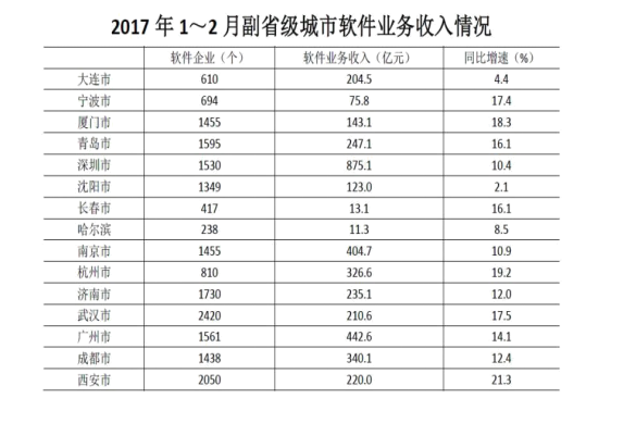2017年1~2月,我國副省級城市實現(xiàn)軟件業(yè)務(wù)收入3874億元,同比增長12.9%。其中,軟件產(chǎn)品收入1216億元,同比增長11.0%;信息技術(shù)服務(wù)收入2042億元,同比增長15.6%;嵌入式系統(tǒng)軟件收入616億元,同比增長8.3%。
