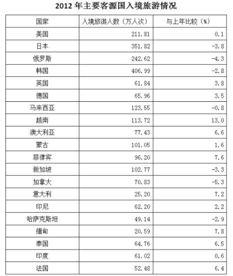 2012年,全國國內(nèi)旅游人數(shù)29.57億人次,比上年增長12.0%。其中,城鎮(zhèn)居民19.33億人次。2012年,全國國內(nèi)旅游收入22706.22億元人民幣,比上年增長17.6%。2012年全年入境外國游客人數(shù)比上年增長0.3%,其中,亞洲市場入境人數(shù)1664.88萬人次,與上年基本持平,占入境外國游客人數(shù)的61.2%;歐洲市場入境人數(shù)592.16萬人次,增長0.2%;美洲市場入境人數(shù)317.95萬人次,減少0.7%;大洋洲市場入境人數(shù)91.49萬人次,增長6.5%;非洲市場入境人數(shù)52.49萬人次,增長7.4%。