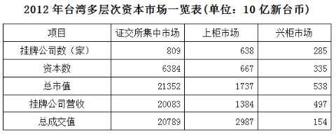 臺灣資本市場第三層次為興柜市場。在準(zhǔn)入門檻方面,興柜市場沒有營業(yè)利潤、資本額、設(shè)立年限的限制,只須符合已經(jīng)申報上市或上柜輔導(dǎo)且兩家以上證券商書面推薦。至2012年底,興柜公司285家,資本額0.335兆新臺幣,總市值0.538兆新臺幣。