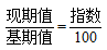 將某一統(tǒng)計(jì)指標(biāo)的基期值看作100,根據(jù)現(xiàn)期值與基期值的實(shí)際比例關(guān)系,算得現(xiàn)期值相當(dāng)于多少,即為現(xiàn)期的指數(shù)。公式一般體現(xiàn)為: