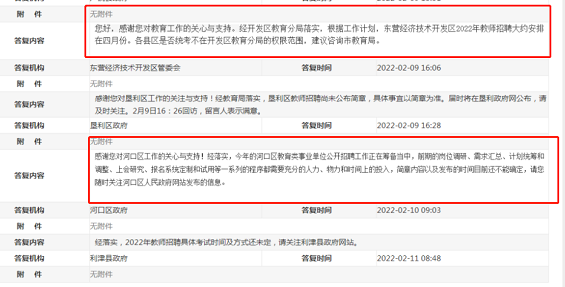以上,其實在今年2月,東營教師招聘公告發(fā)布時間就初見端倪,各區(qū)縣在政府門戶網(wǎng)站“網(wǎng)上民聲”專欄中分別回復(fù)了關(guān)于東營教招的消息,其中,經(jīng)濟(jì)技術(shù)開發(fā)區(qū)在回復(fù)中表示:“東營經(jīng)濟(jì)技術(shù)開發(fā)區(qū)2022年教師招聘大約安排在四月份。”