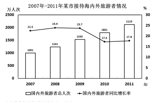 2011年,某市接待海內(nèi)外旅游者2123萬人次,同比增長(zhǎng)17.8%。其中,接待入境旅游者87.71萬人次,同比增長(zhǎng)8.2%。在入境旅游者中,外國(guó)旅游者51.1萬人次,同比下降.8.6%;港澳臺(tái)旅游者36.61萬人次,同比增長(zhǎng)43%。全年旅游總收入168.15億元,同比增長(zhǎng)27.20億元。其中,國(guó)際旅游創(chuàng)匯2.44億美元,同比增長(zhǎng)10.9%。