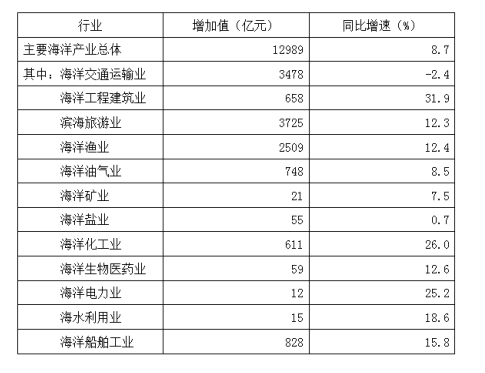 2009年全國(guó)海洋生產(chǎn)總值31964億元,比上年增長(zhǎng)8.6%。全國(guó)海洋生產(chǎn)總值占國(guó)內(nèi)生產(chǎn)總值的9.53%,占沿海地區(qū)生產(chǎn)總值的15.5%。海洋第一產(chǎn)業(yè)增加值1879億元,海洋第二產(chǎn)業(yè)增加值15062億元,海洋第三產(chǎn)業(yè)增加值15023億元。