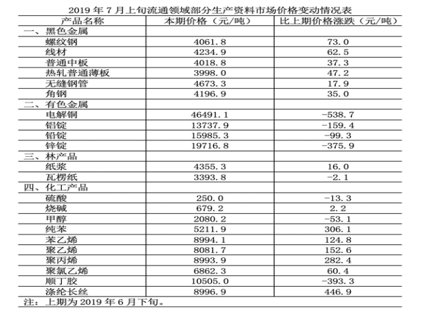 B.2019年7月上旬,黑色金屬中的線材價格環(huán)比漲幅最快