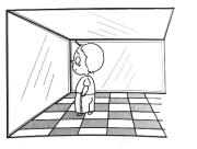 20、如下圖所示,房間中互相垂直的墻和天花板都是由鏡子構(gòu)成,形成了3個(gè)兩兩互相垂直的平面鏡。站在其中的小明會(huì)成多少個(gè)像( )。