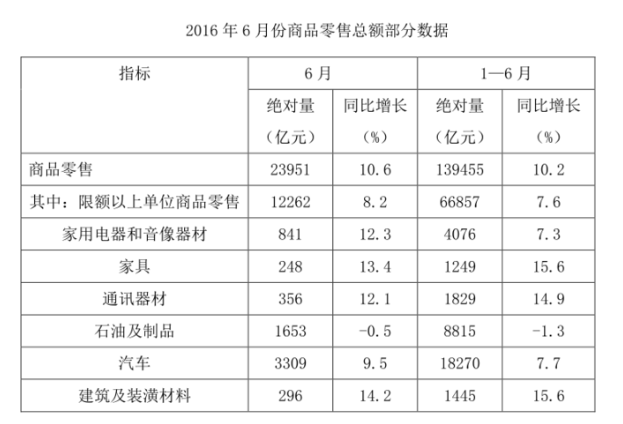 按消費(fèi)類(lèi)型分,2016年6月份,餐飲收入2907億元,同比增長(zhǎng)11.1%;商品零售23951億元,同比增長(zhǎng)10.6%。1-6月份,餐飲收入16683億元,同比增長(zhǎng)11.2%;商品零售139455億元,同比增長(zhǎng)10.2%。