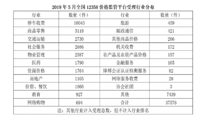 2019年5?,全國12358價格監(jiān)管平臺受理價格舉報、投訴、咨詢共計37576件,同?下降40.70%,環(huán)?下降9.31%。其中,價格舉報4192件,環(huán)?下降19.06%;價格投訴2059件,環(huán)?下降15.92%;價格咨詢31325件,環(huán)?下降7.34%。平臺受理量排名前?的省份依次是北京(5786件)、江蘇(3528件)、上海(2499件)、重慶(2486件)、河南(2469件)、陜西(2440件)、浙江(2321件)、天津(1571件)、福建(1483件)、?西(1309件)。平臺受理量?業(yè)分布如下表所?: