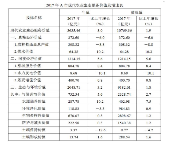 B.2017年A市現(xiàn)代農(nóng)業(yè)生態(tài)服務(wù)價值年值增長率、貼現(xiàn)值增長率最低的是同一個指標(biāo)