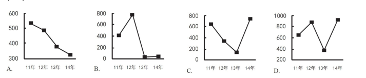 119.以下哪項的折線圖可以準確表現2011~2014年間,我國會展業(yè)總產值同比增量的變化情況(單位:億元)?( )