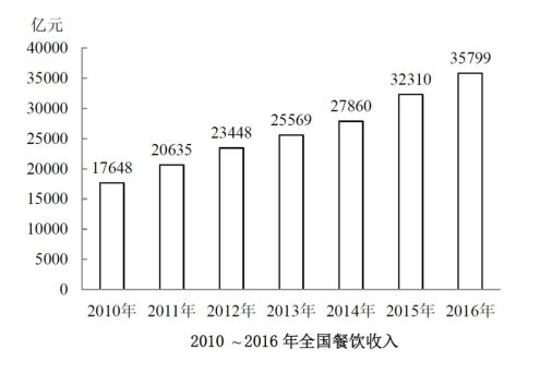 C、2016年全國餐飲收入比2010年翻了一番以上