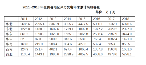 B.2017年華北地區(qū)風(fēng)力發(fā)電年末累計裝機(jī)容量同比增長了一成以上