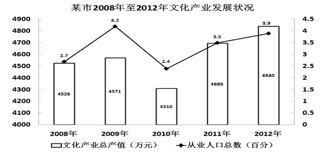 C、該市文化產(chǎn)業(yè)總產(chǎn)值最高的年份是2012年 D、該市文化產(chǎn)業(yè)從業(yè)人口增長最快的年份是2011年