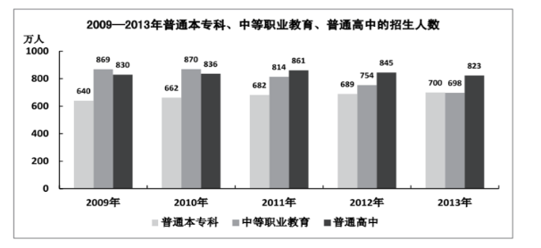 D、2009—2013年,普通本專科的招生人數(shù)總是比中等職業(yè)教育少