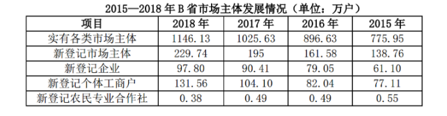 近年來,B省營商環(huán)境不斷優(yōu)化,市場活力不斷增強(qiáng),新登記市場主體保持較快增長勢頭。2018年,全省新登記市場主體229.74萬戶,日均新登記市場主體6294萬戶,同比增長17.82%。