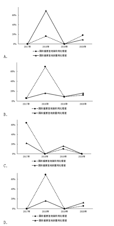 94. 以下選項中,最準確地反映了2017-2020年我國國際重要濕地面積、數(shù)量同步增速變化情況的是( )