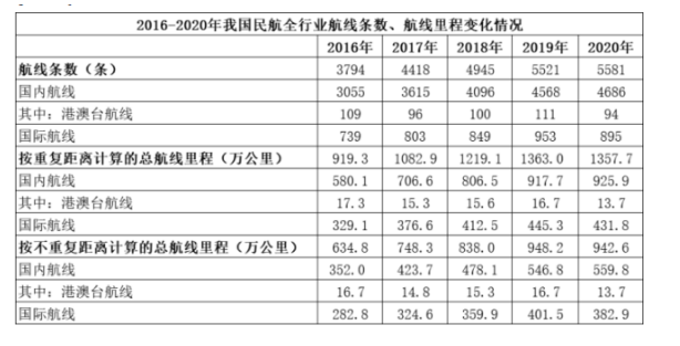 C.2016-2020年,按重復距離計算的總航線里程公里數(shù)年均增長不到100萬