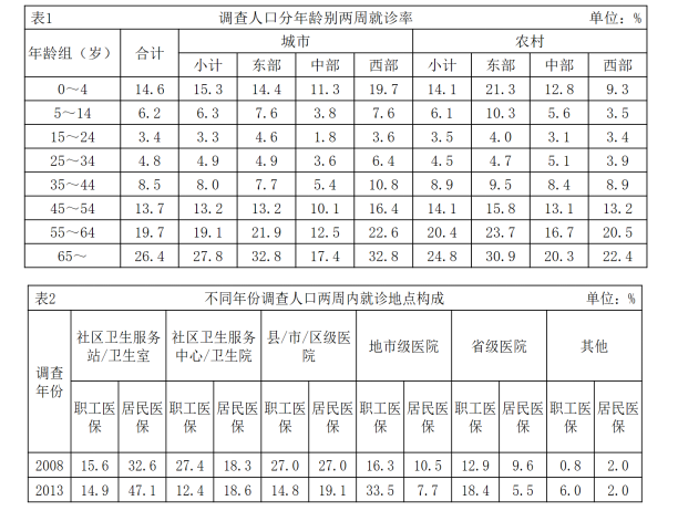 兩周就診率被定義為每百人中兩周內因病或身體不適尋求各級醫(yī)療機構治療服務的人次數。第五次國家衛(wèi)生服務調查結果顯示,調查地區(qū)居民兩周就診率為13.0%,其中城市地區(qū)為13.3%,農村地區(qū)為12.8%。城市地區(qū),東部、中部、西部兩周就診率分別為15.4%、8.8%、15.8%;農村地區(qū),東部、中部、西部兩周就診率分別為16.1%、11.4%、11.0%。