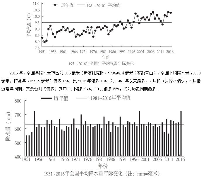2016年,全國平均氣溫10.36℃,較常年平均氣溫偏高0.81℃,為1951年以來第三高,僅次于2015年(10.49℃)和2007年(10.45℃)。2016年四季氣溫均偏高,其中夏季氣溫為歷史最高;除1月偏低、11月接近常年同期外,其余各月均偏高,其中12月偏高2.6℃,為歷史同期最高。全國31個?。▍^(qū)、市)中,僅黑龍江平均氣溫較常年偏低0.2℃,其他?。▍^(qū)、市)氣溫均偏高,其中青海、甘肅、河南和貴州4省均為1951年以來的歷史最高。