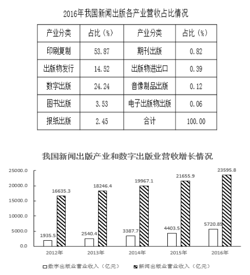 B、2016年,對(duì)我國(guó)新聞出版產(chǎn)業(yè)營(yíng)收增長(zhǎng)貢獻(xiàn)最大的是印刷復(fù)制業(yè)