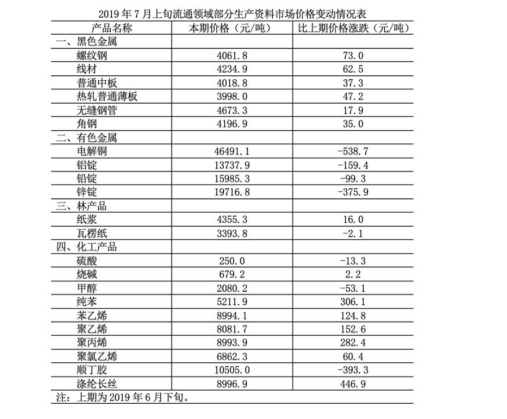 B.2019年7月上旬,黑色金屬中的線材價(jià)格環(huán)比漲幅最快