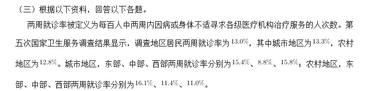 120.關(guān)于第五次國(guó)家衛(wèi)生服務(wù)調(diào)查中調(diào)查地區(qū)的兩周就診率,下列說(shuō)法正確的是:( )