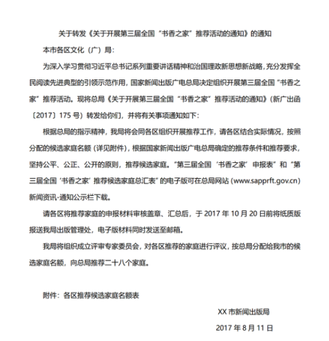 A.XX市新聞出版局關(guān)于開展第三屆全國“書香之家”推薦活動(dòng)的通知