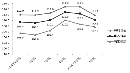 2015年2季度,Z省城鄉(xiāng)消費(fèi)者信心指數(shù)均呈下行態(tài)勢(shì),其中,城鎮(zhèn)消費(fèi)者信心指數(shù)為111.1,較一季度下降1.4個(gè)百分點(diǎn);農(nóng)村消費(fèi)者信心指數(shù)指數(shù)為108.7,較一季度下降3.4個(gè)百分點(diǎn)。
