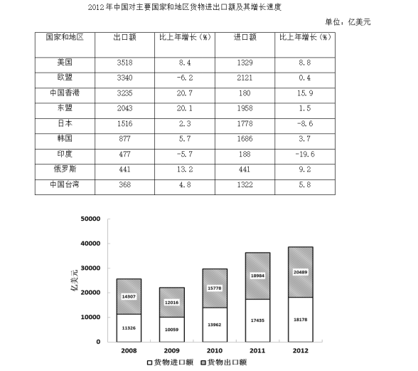 B、2008~2012年間,中國(guó)貨物出口總額逐年上升