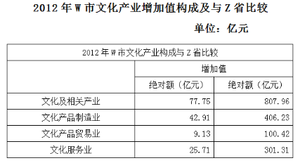 2012年,Z省W市實(shí)現(xiàn)文化及其相關(guān)產(chǎn)業(yè)增加值比上半年增長(zhǎng)9.6%。在文化產(chǎn)品制造業(yè)中,文化印刷、文化用品制造和公益美術(shù)品制造三大主導(dǎo)行業(yè),2012年分別實(shí)現(xiàn)增加值21.82億元、11.57億元、6.62億元。