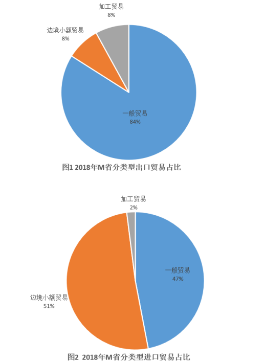 2018年,M省進出口總值達到1034.4億元,比上年增長9.9%。其中,出口378.6億元,增長14.4%;M省加工貿(mào)易進出口總值比上年增長82.1%。與“一帶一路”沿線國家貿(mào)易保持快速增長,其中對蒙古國、越南、德國、荷蘭進出口分別比上年增長24.1%、1.4倍、64.2%和40.3%。全省實際利用外資31.6億美元,比上年增長0.3%。