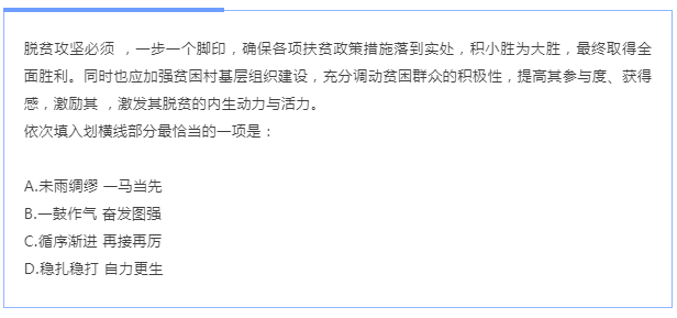 C項“循序漸進”是按一定的順序、步驟逐漸進步,符合文意。D項“穩(wěn)扎穩(wěn)打”比喻有把握、有步驟地工作,符合文意。然后 分析第二空。根據(jù)“激發(fā)其脫貧的內生動力與活力”可知,這里強調的是主要依靠自身的力量。