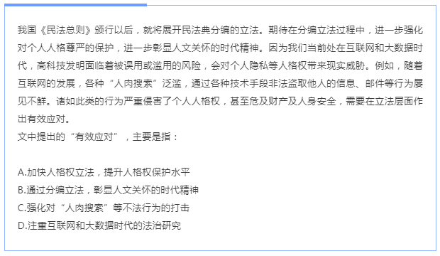 【解析】本題是語句理解題,側重考察對語句的理解是否全面和正確。首先找到 “有效應對”,它在文段最后一句“需要在立法層面做出有效應對”。根據(jù)就近原則向前找,“諸如此類的……需要……”,說明“有效應對”解決的是“此類行為”,而“此類”需繼續(xù)向前找,前一句是例如,表舉例,繼續(xù)向前找,“會對個人隱私權等人格權帶來顯示威脅”,故應對的是人格權帶來的威脅。所以 對比選項,A項提到“人格權”和“立法”。因此,選擇A選項。