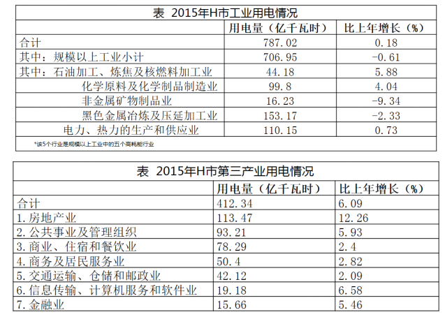2015年,H市全社會(huì)用電量1405.55億千瓦時(shí),比上年增長(zhǎng)2.76%。全年各產(chǎn)業(yè)和生活用電情況分別為:第一產(chǎn)業(yè)用電量7.35億千瓦時(shí),比上年增長(zhǎng)1.30%;第二產(chǎn)業(yè)用電量800.37億千瓦時(shí),比上年增長(zhǎng)0.14%;第三產(chǎn)業(yè)用電量412.34億千瓦時(shí),比上年增長(zhǎng)6.09%;生活用電量由城鎮(zhèn)居民用電量與鄉(xiāng)村居民用電量構(gòu)成,共計(jì)185.49億千瓦時(shí),比上年增長(zhǎng)6.67%,其中,城鎮(zhèn)居民用電量增長(zhǎng)6.64%,鄉(xiāng)村居民用電量增長(zhǎng)8.91%。