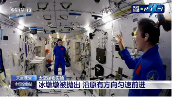 在約45分鐘的授課中,翟志剛、王亞平、葉光富相互配合,生動演示微重力環(huán)境下太空“冰雪”實驗、液橋演示實驗、水油分離實驗、太空拋物實驗,深入淺出講解實驗現(xiàn)象背后的科學原理,同時展示了部分空間科學設施,介紹了在空間站的工作生活情況。授課期間,航天員通過視頻通話形式與地面課堂師生進行了互動交流。