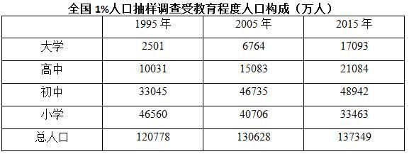 2005年全國(guó)1%人口抽樣調(diào)查主要數(shù)據(jù)公報(bào)顯示,同2000年第五次全國(guó)人口普查相比,2005年具有大學(xué)教育程度的人口增加2193萬(wàn)人;具有高中教育程度的人口增加974萬(wàn)人;具有初中教育程度的人口增加3746萬(wàn)人,具有小學(xué)教育程度的人口減少4485萬(wàn)人。