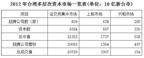 臺(tái)灣資本市場第三層次為興柜市場。在準(zhǔn)入門檻方面,興柜市場沒有營業(yè)利潤、資本額、設(shè)立年限的限制,只須符合已經(jīng)申報(bào)上市或上柜輔導(dǎo)且兩家以上證券商書面推薦。至2012年底,興柜公司285家,資本額0.335兆新臺(tái)幣,總市值0.538兆新臺(tái)幣。