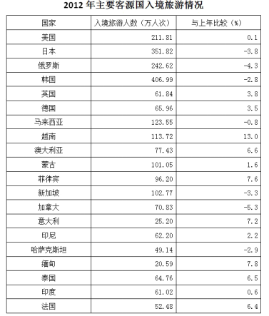 2012年,全國國內(nèi)旅游人數(shù)29.57億人次,比上年增長12.0%。其中,城鎮(zhèn)居民19.33億人次。2012年,全國國內(nèi)旅游收入22706.22億元人民幣,比上年增長17.6%。2012年全年入境外國游客人數(shù)比上年增長0.3%,其中,亞洲市場入境人數(shù)1664.88萬人次,與上年基本持平,占入境外國游客人數(shù)的61.2%;歐洲市場入境人數(shù)592.16萬人次,增長0.2%;美洲市場入境人數(shù)317.95萬人次,減少0.7%;大洋洲市場入境人數(shù)91.49萬人次,增長6.5%;非洲市場入境人數(shù)52.49萬人次,增長7.4%。