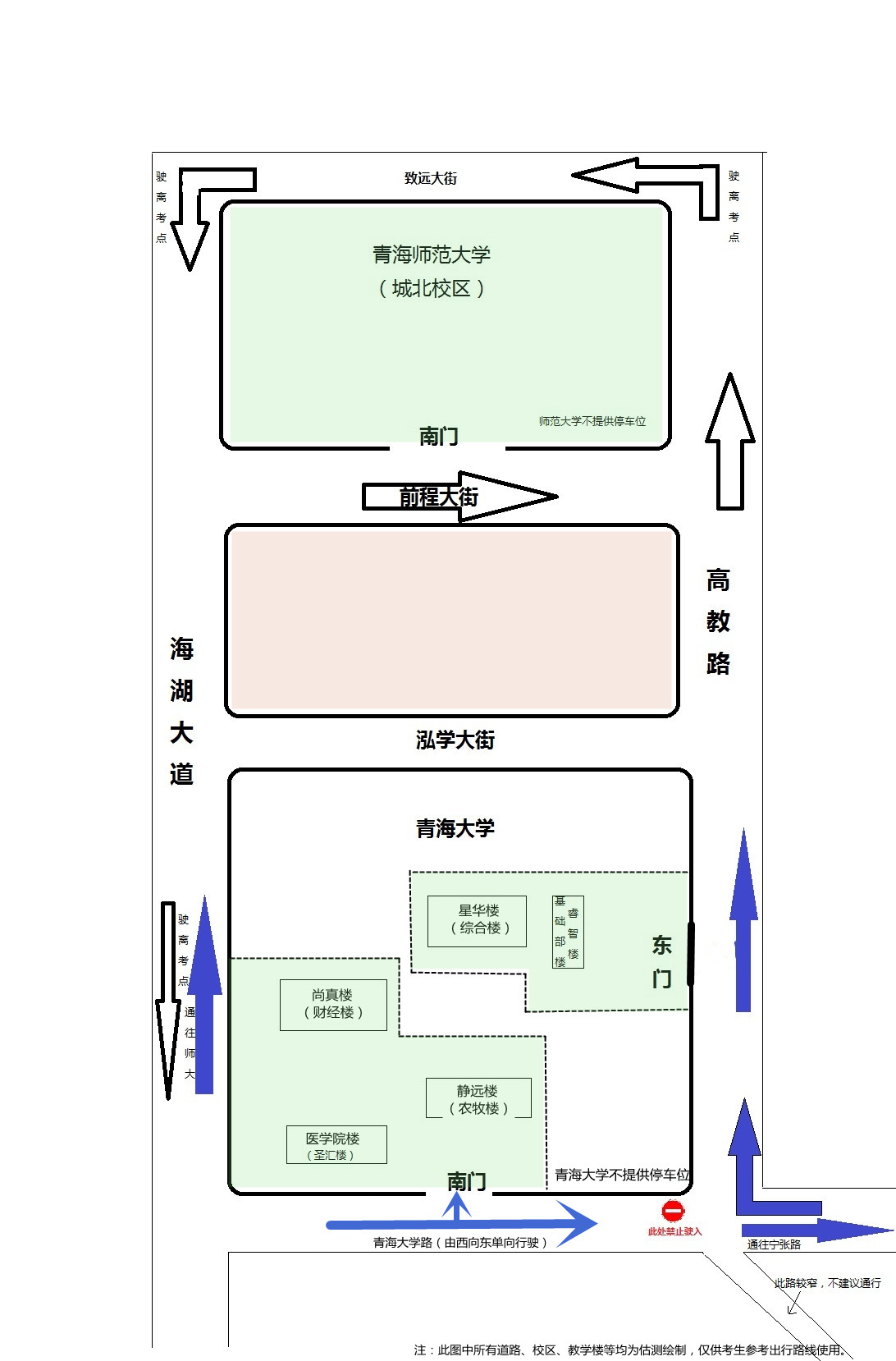 2、由于青大路交通管制,送考車輛只能由西向東單向行駛,在青海大學(xué)南門附近停車落客后,應(yīng)及時(shí)從寧張路駛離,也可經(jīng)高教路、泓學(xué)大街或致遠(yuǎn)大街,從海湖大道駛離。