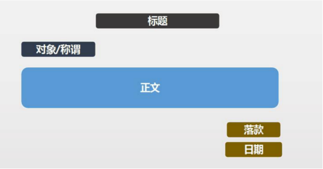 在圖片上,我們可以清晰地看到應(yīng)用文的格式包括五個(gè)要素:一是標(biāo)題,位置需要居中,也就是前后空格一樣多;二是對(duì)象,位置需要另起一行頂格寫,表明該篇應(yīng)用文是發(fā)給哪個(gè)單位的;三是正文,向發(fā)文對(duì)象闡明發(fā)文的目的和要求,該部分內(nèi)容要符合“工作目標(biāo)”;四是落款,位置靠右,表明發(fā)文單位;五是日期,位置靠右,與上一行的“落款”對(duì)齊。