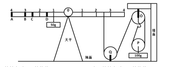 85.如圖所示,地面上有一架天平,天平左端系有一個(gè)50g的物體,右端通過繩子連接一組滑輪。滑輪組合中,O、Q為定滑輪,P為動(dòng)滑輪,下端系有一個(gè)100g的物體。要使天平兩端平衡,需要的操作是( )。